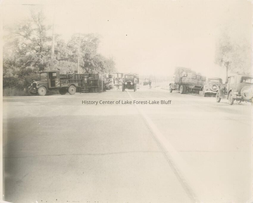 Intersection of Route 43 (Waukegan Road) and Route 60 (Kennedy Road), looking south on Waukegan. Traffic accident - a truck is turned over on its side. Several other vehicles are parked on the side of the road, including a police car, a truck with bales of hay, and a tow truck from Kostial's Garage.Lexicon