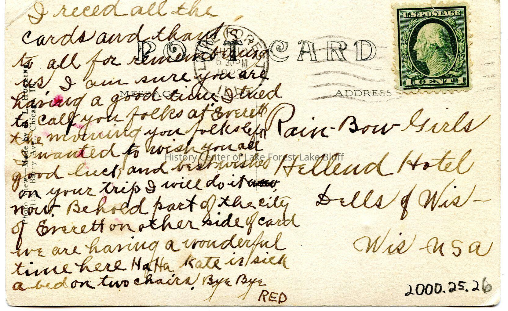 Postcard labeled "Waukegan Road at Everett, ILL." Shows an intersection with a home and a church visible and possibly a gas station. Intersection of Waukegan Road and Everett Road. St. Patrick Church is on the right. Dated 1923. Reverse is addressed to "Rain-Bow Girls, Hellend Hotel, Bells of Wis," and signed "RED."