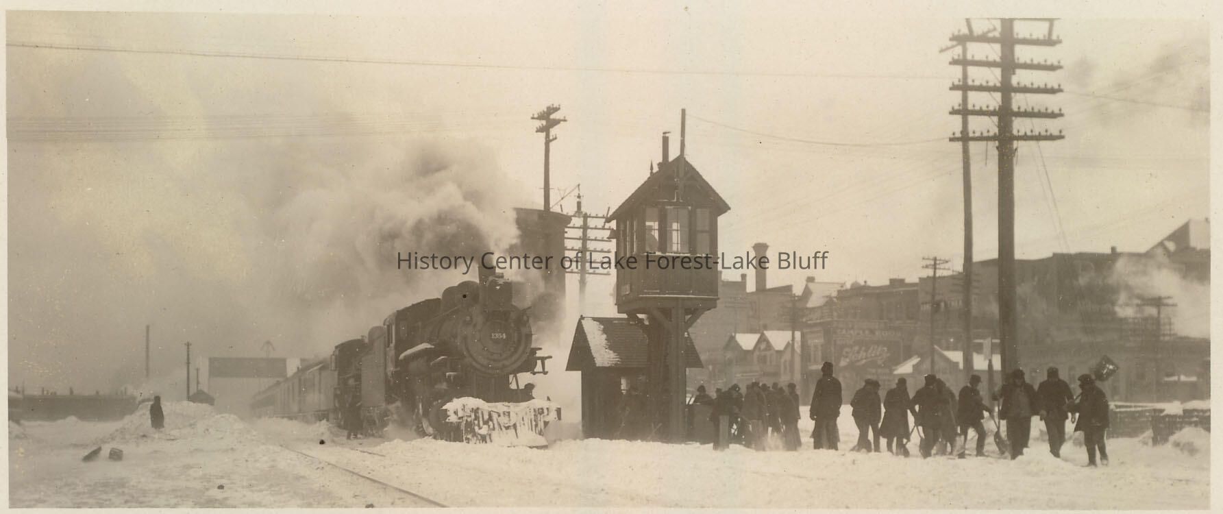 Caption by Bob Janz: "A Double headed passenger train with engine 1354 ahead, spotted at a water tank on the left side of the engines. The train is headed north at Madison Street crossing in Waukegan, Illinois. Engine 1354, a class R-1 Ten-Wheeler, 4-6-0 type, was built by Schenectady in August of 1906. The second engine appears to be a class D 4-4-2. At the south end of the train is a footbrige over the tracks connecting the depot and snow covered platforms to the left. A Sanborn train order signal and a roundhouse also appear to the south at rear of train. Snow shovel gangs as seen here were often recruited in Chicago and sent by train to locations where help was needed when the railroad's labor force was insufficient to cope with the situation. Date unknown.
