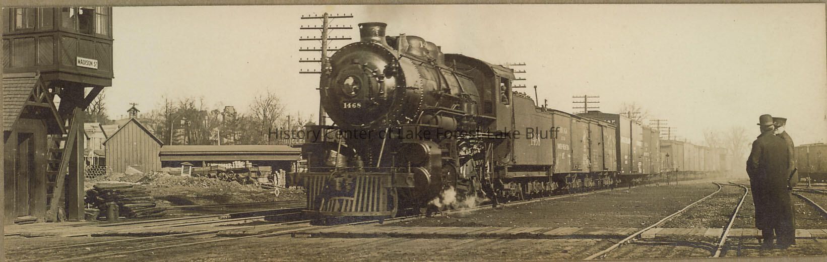 Caption "A short freight headed south at the Madison Street crossing in Waukegan, Illinois. Engine 1468, a class Z Consolidation was built by Schenectady in November of 1909. The cars in this train are of all-wood construction indicating the era to be prior to World War I. The street crossing is apparently protected by two watchmen; a high level watchman evidently alerts a low level watchman with bell when trains approach. Date unknown."
