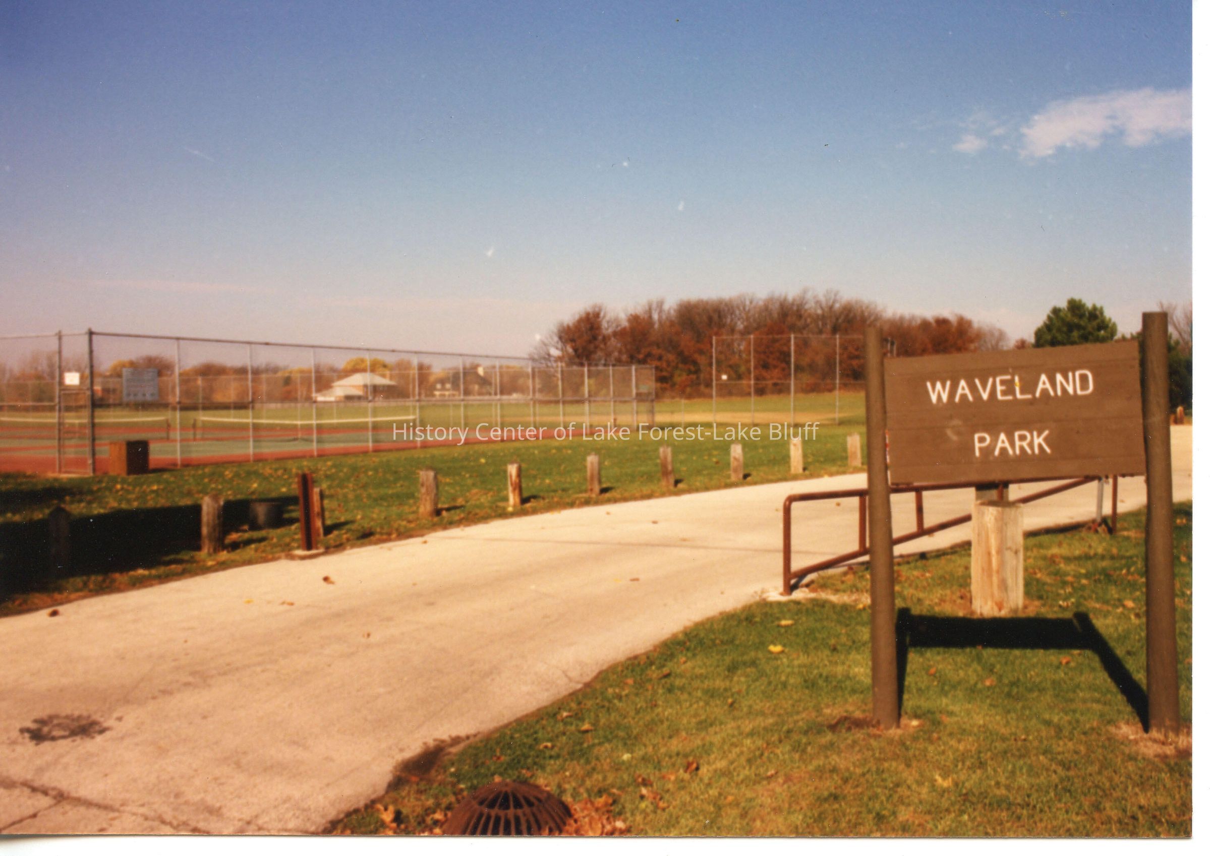 Color photograph of Waveland Park sign and tennis courts. Fall, autumn.