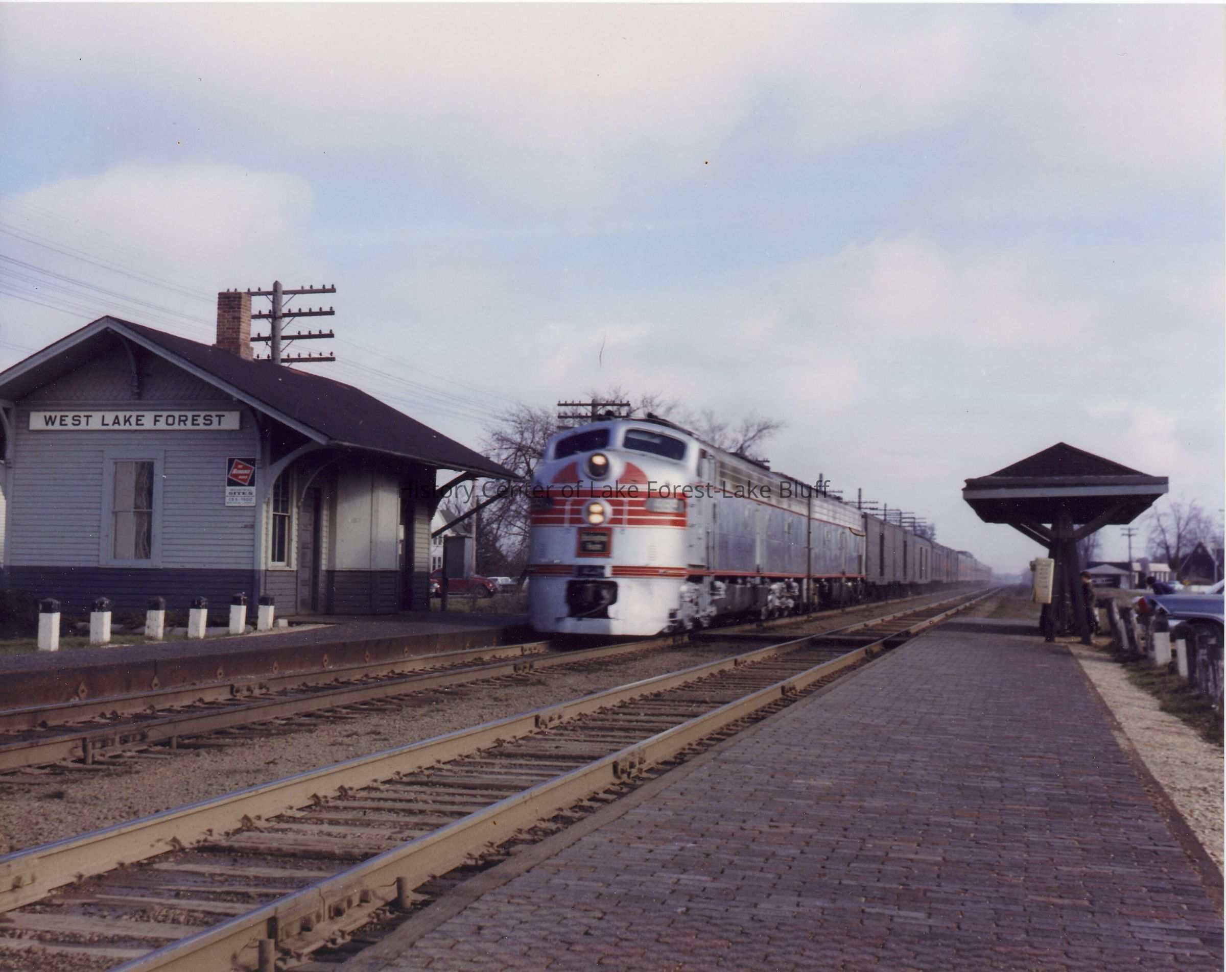 Color Photograph of the West Lake Forest Train Station and Train. Donor Ron Seyl has written the following note on the back of the photo: