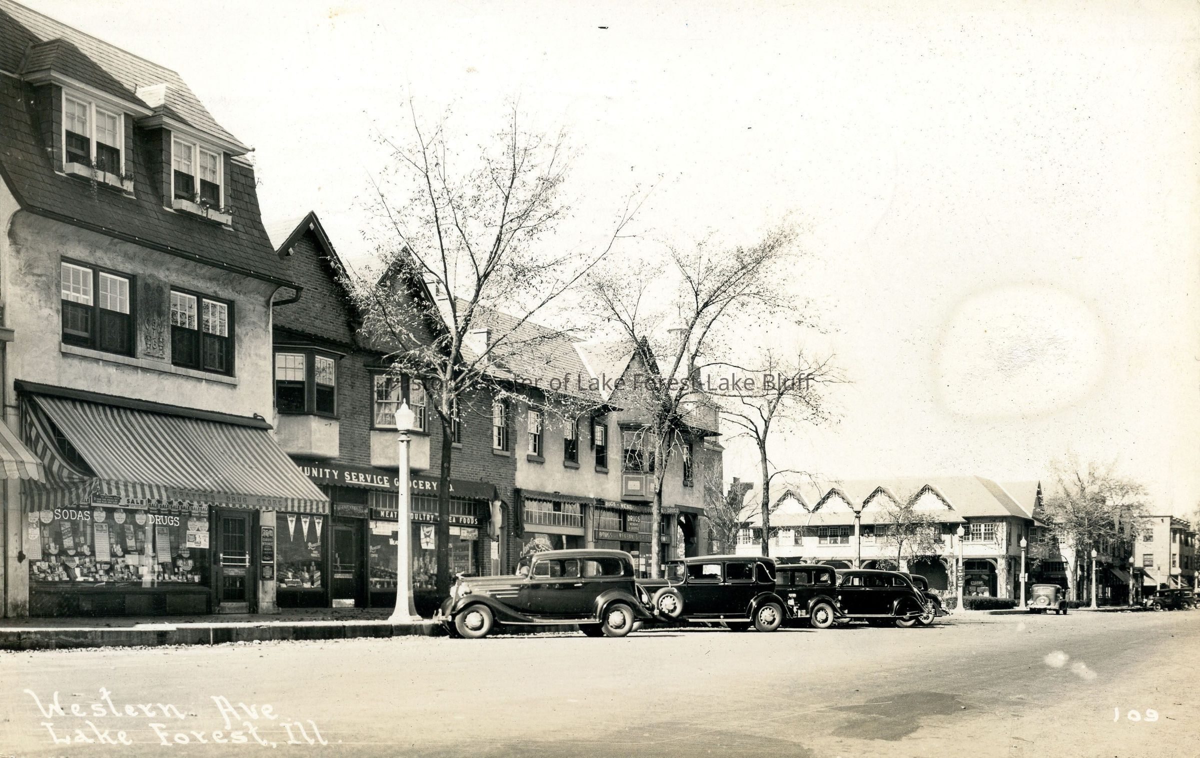 Postcard dated September 2, 1937 showing Western Avenue and Market Square with cars parked on the street. Krafft's Drug Store, Community Service Grocery and Wenban and Griffis Drug Store are visible.