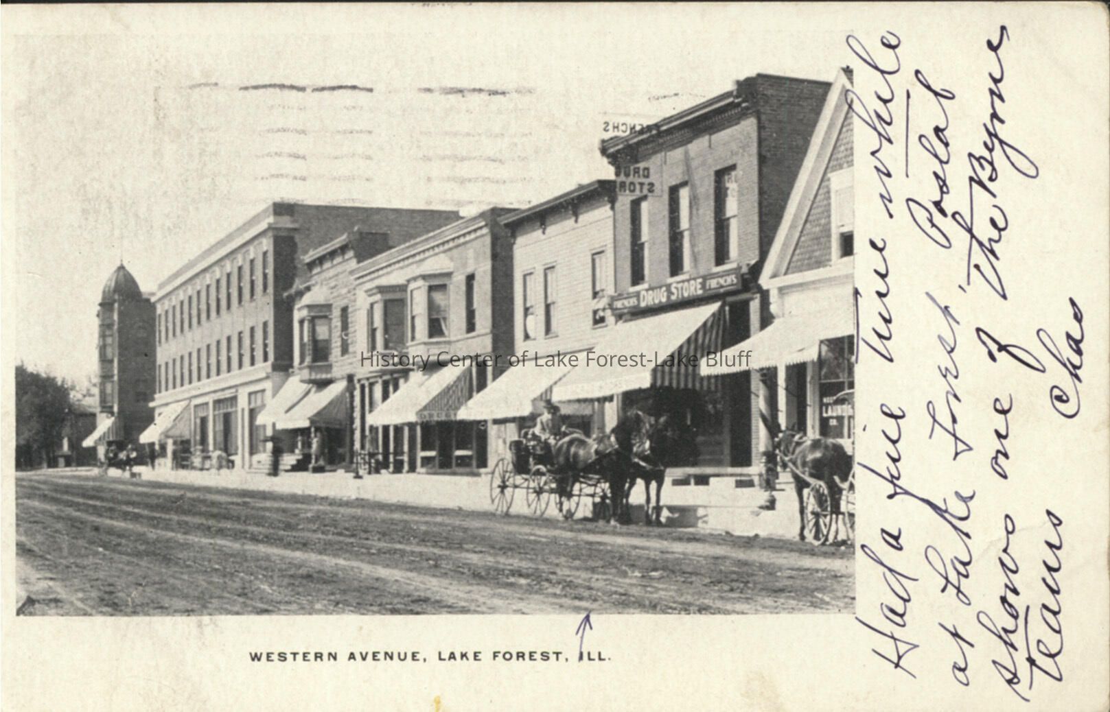 Handwritten note in black ink reads, "Had a fine time while at Lake Forest. Postal shows one of the Byrne teams." Signed "Chas." Verso addressed to Ms. Nellie Mulcione, St. Ignace, Mich.