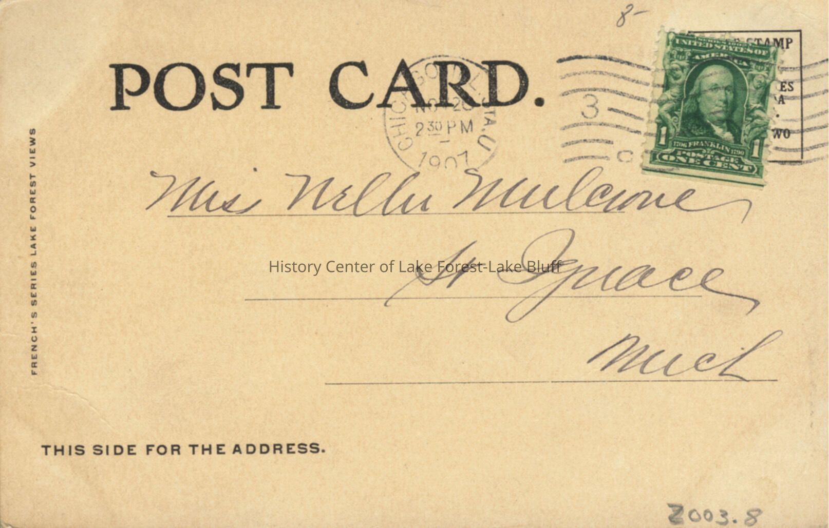 One cent green stamp with Benjamin Franklin's image, postmarked 1907
