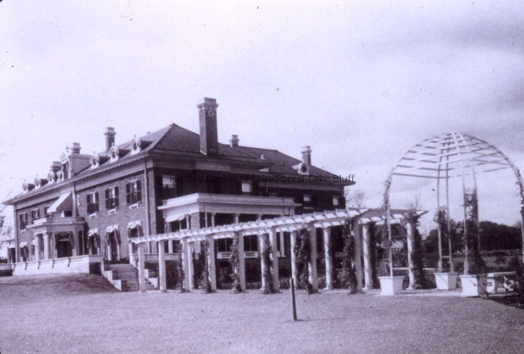 Westmoreland built by A.B. Dick in 1902 by architect James G. Rogers at 537-549 King Muir Road as a forty-acre summer estate near Deerpath and Waukegan Road. The name "Westmoreland" was taken from Westmoreland County, Pennsylvania where Mr. Dick had spent some time. The main house designed by Rogers was constructed of brick and stone and built in the French Renaissance style, had twenty rooms, sleeping porches (added around 1910) The house was razed in 1948. In 1939, Albert Dick's widow Mary gave 24 acres of the farm as a site for the new hospital to replace Alice Home Hospital on the Lake Forest College campus. She also left an additional 60 acres in her will in 1944, which included the manor house, garage, barn and several cottages of the original estate. Stanley Anderson, who built Lake Forest Hospital copied the manor house for the original hospital building. owners: Albert Blake Dick Sr. and Mary Mathews Dick print of image is 2002.289.13