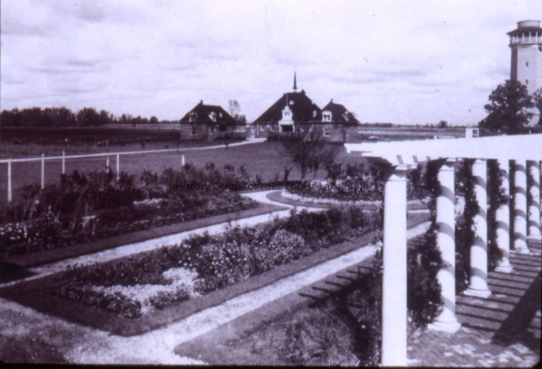 Westmoreland built by A.B. Dick in 1902 by architect James G. Rogers at 537-549 King Muir Road as a forty-acre summer estate near Deerpath and Waukegan Road. The name "Westmoreland" was taken from Westmoreland County, Pennsylvania where Mr. Dick had spent some time. The main house designed by Rogers was constructed of brick and stone and built in the French Renaissance style, had twenty rooms, sleeping porches (added around 1910) The house was razed in 1948. In 1939, Albert Dick's widow Mary gave 24 acres of the farm as a site for the new hospital to replace Alice Home Hospital on the Lake Forest College campus. She also left an additional 60 acres in her will in 1944, which included the manor house, garage, barn and several cottages of the original estate. Stanley Anderson, who built Lake Forest Hospital copied the manor house for the original hospital building. owners: Albert Blake Dick Sr. and Mary Mathews Dick gardens print of image is 2002.289.12