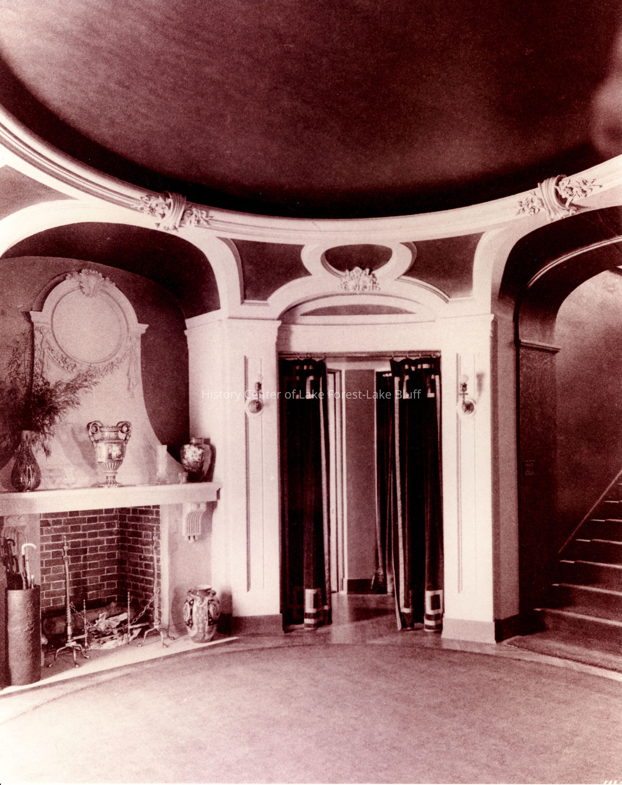 House interior of entry hall with fireplace and staircase. House was demolished circa 1940s