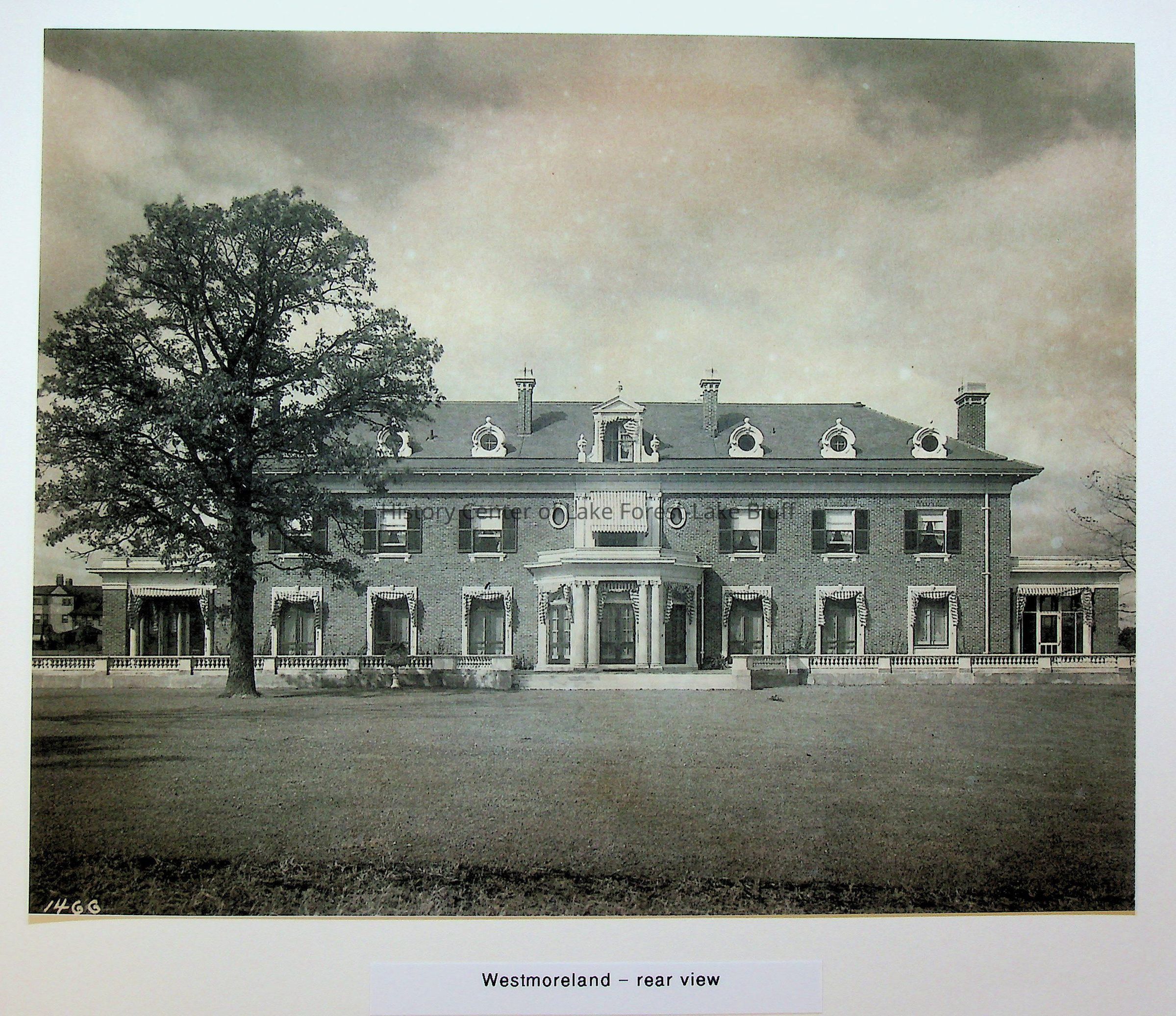 Rear view of Westmoreland Farm, Dick family estate, 870 Deerpath, built 1903. Architect James Gamble Rogers.