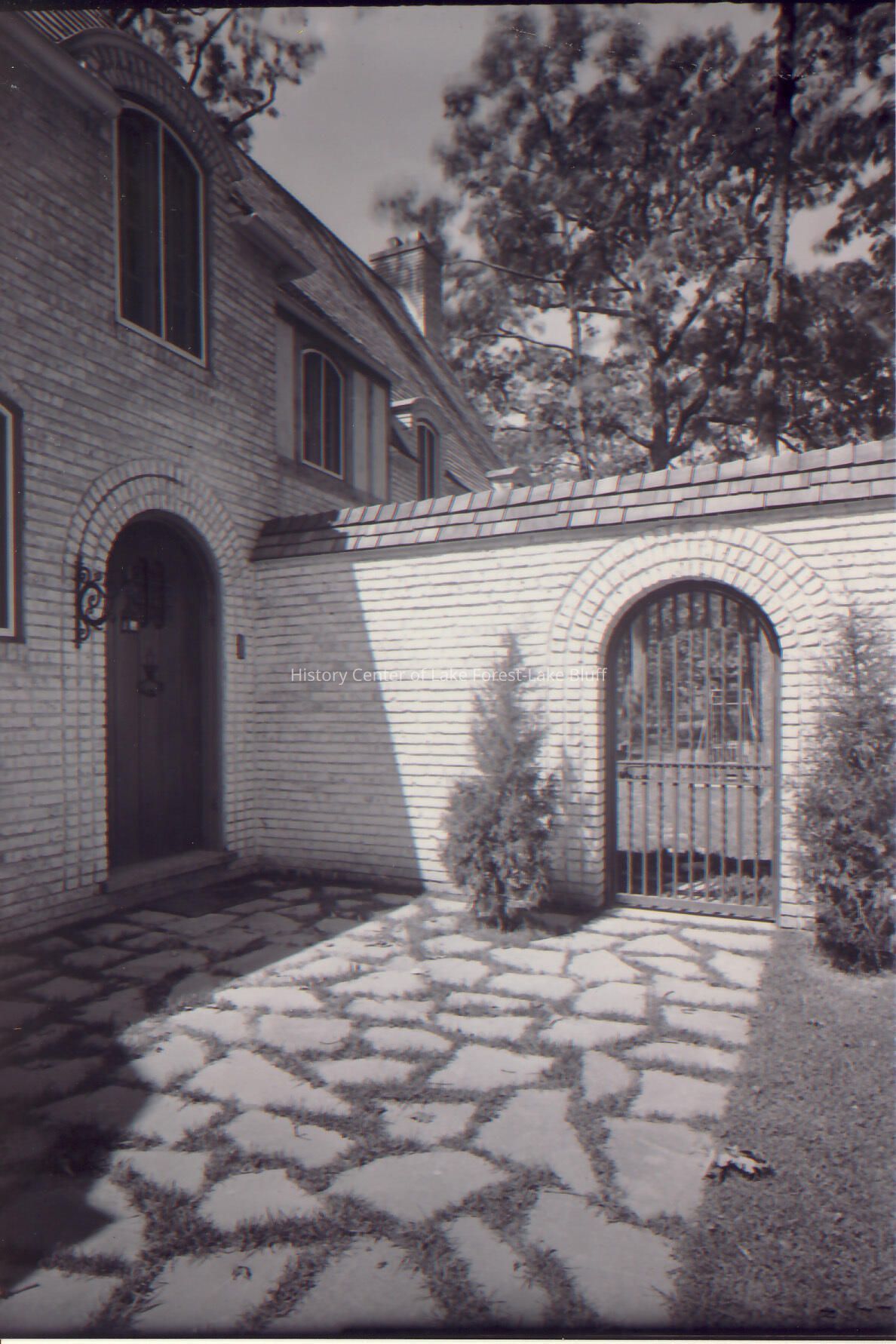 Close up of exterior of Walter Frazier home built for William C. Hubbard in 1924. Located at 1087 Edgewood Road in Lake Forest, Illinois. (Black and White Image)