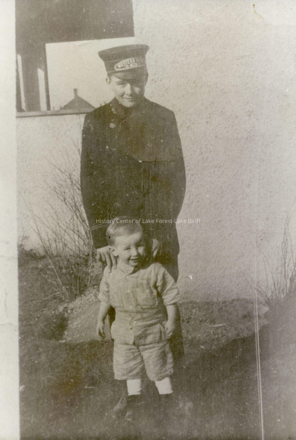 An original photo from 1916-1917, showing William Kiddle (1902-1988) at age 14. William was the third son of Charles and Anne Kiddle of 895 Summit Avenue, Lake Forest. William is wearing a Western Union telegraph delivery boy's uniform. With William in the photo is his little brother Charlie.