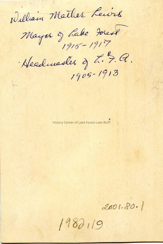 William Mather Lewis, Mayor of Lake Forest 1915-1917, Headmaster of Lake Forest Academy 1905-1913. see 2001.80.2 for an article written by William Mather Lewis titled, "Place of the Church in the War"