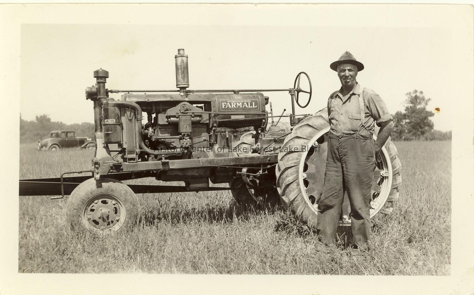 A tractor. Make of tractor is an F-30 McCormick-Deering "Farmall." William Sneddon, Farm Manager of Everett Stock Farm is standing in front of the tractor. A car is parked in the background. Swift Farm,.