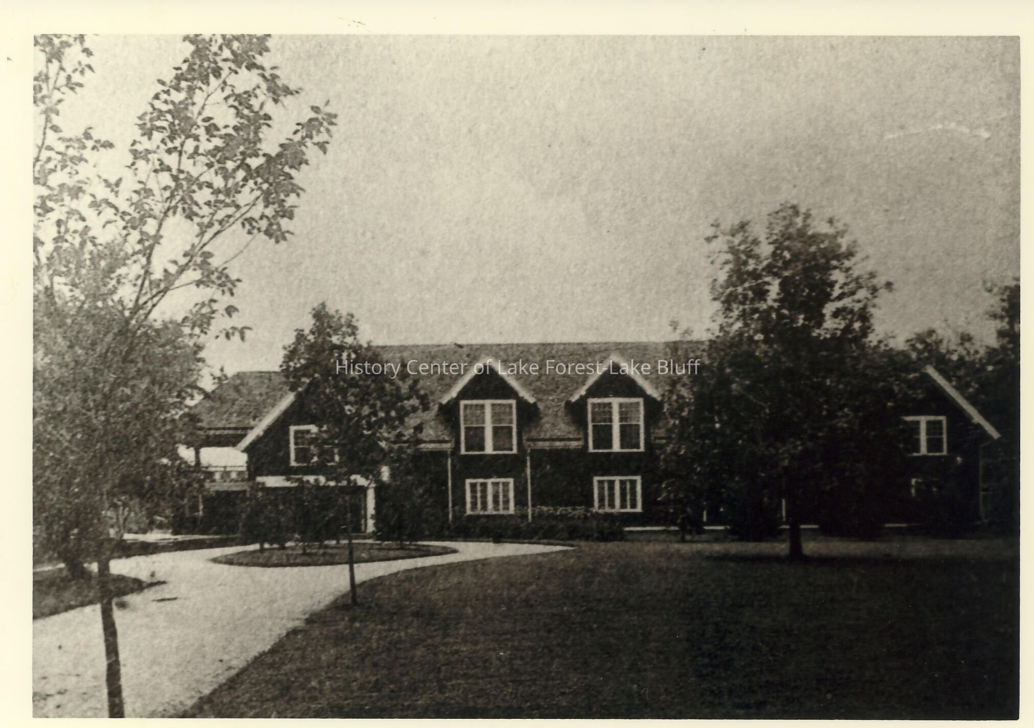 Long, low frame building with gable-topped wings and three dormers above the ground floor. There is a porch with Doric columns. reprint