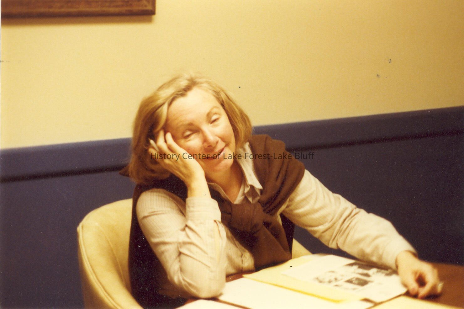 Woman sitting at table, her head in her hands, eyes almost closed. She is looking at printed material