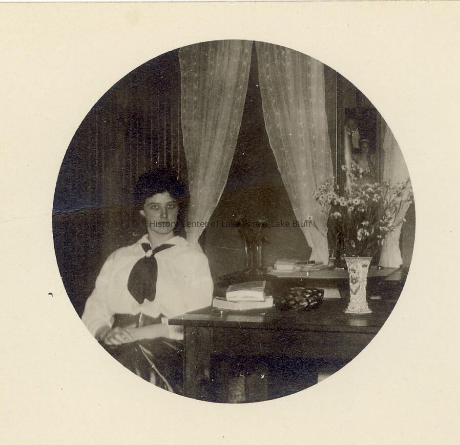 A young woman sitting next to a table doing needlework. The photo is in a circle.