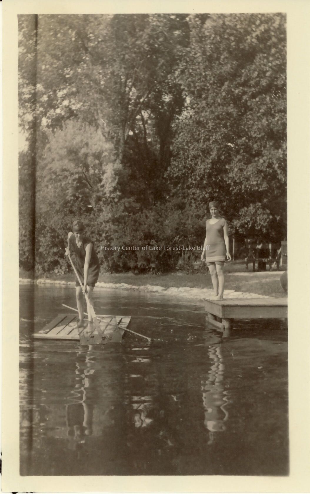 Robert and Grace Farwell McGann family. Two women on Farwell Pond in bathing suits. One is standing on a pier and the other is standing on a raft holding a net in the water. Swimming in summer. 965 E. Deerpath - Fairlawn