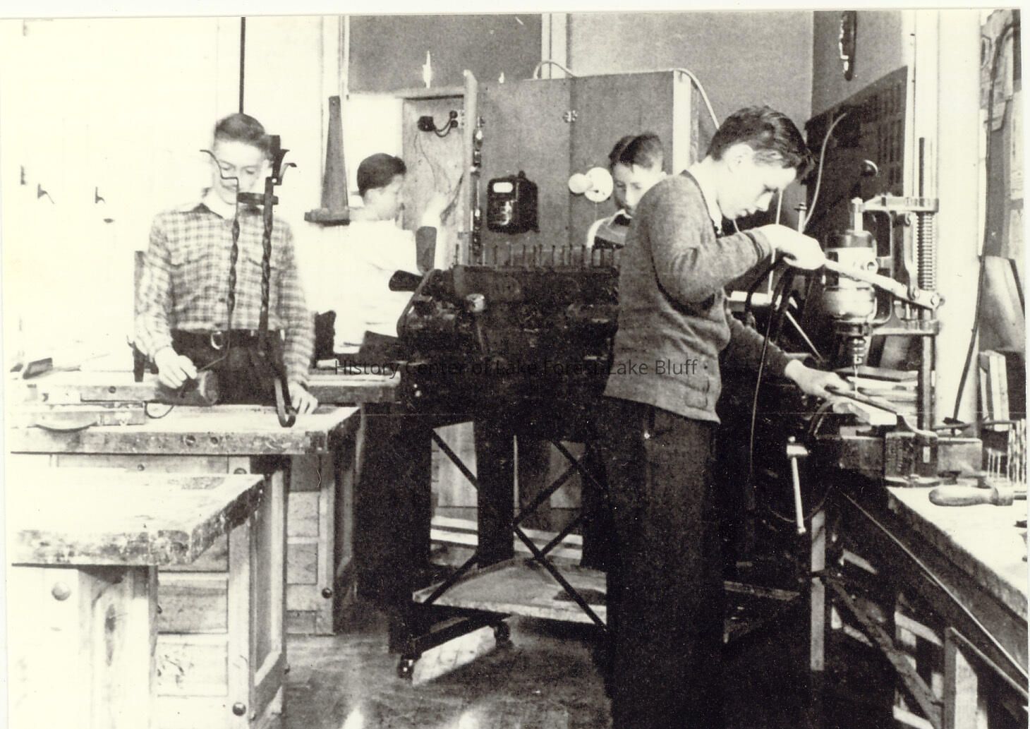 Four Students assembling in wood shop, one pictured is Wally Brooks