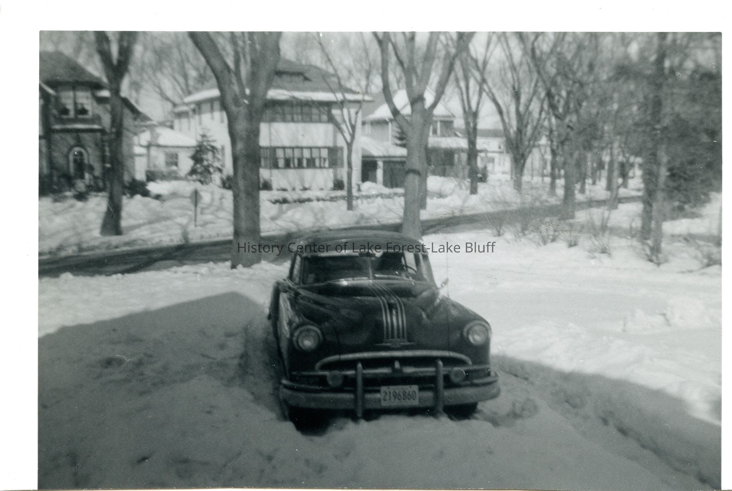 Car (possibly 1949 Pontiac Chieftan) parked in snow in driveway on Woodland Road.