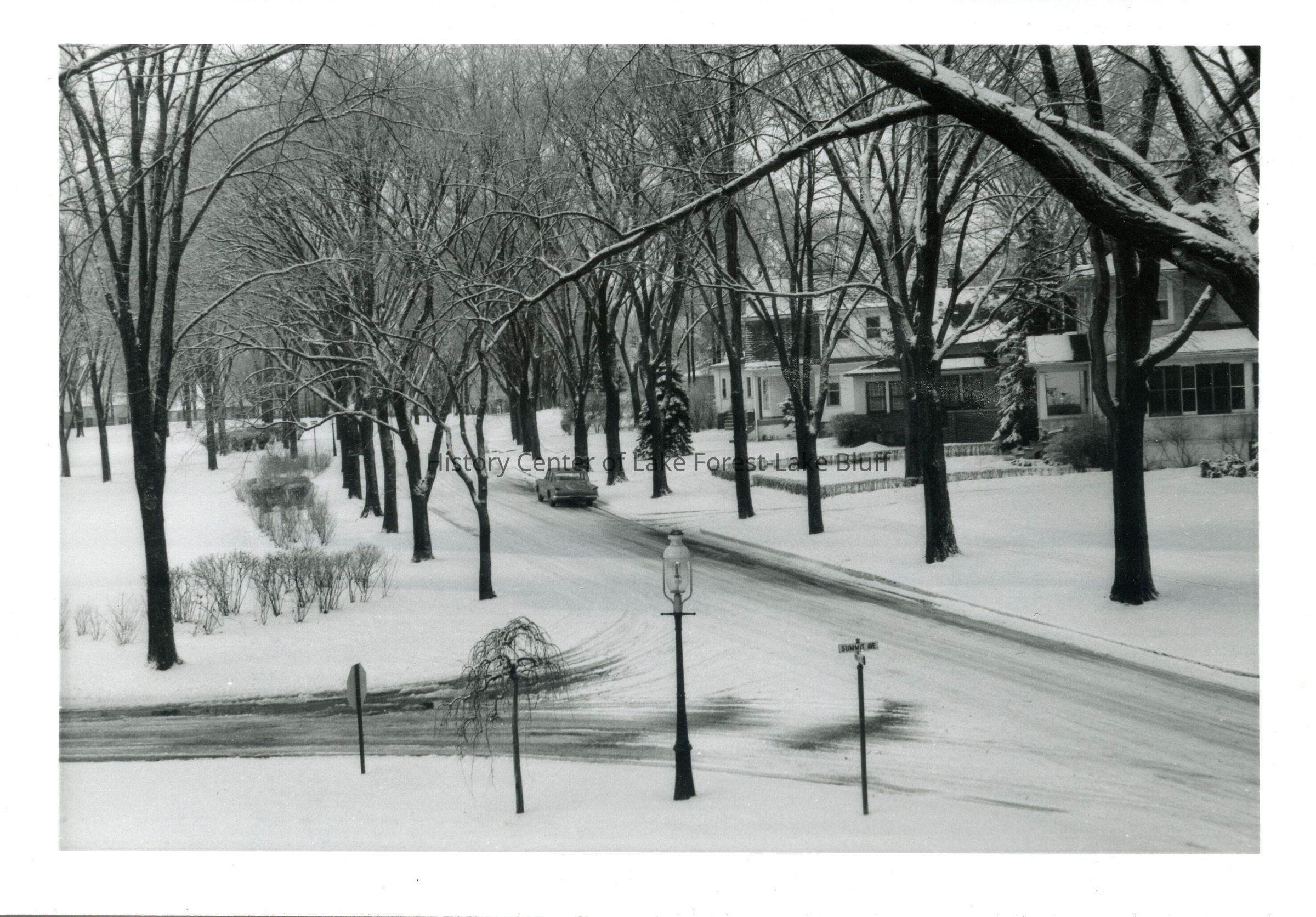 Winter scene (snow) looking out second story window across street at park. Lamppost is visible. Woodland Road. Similar to 2018.9.81 and 2018.9.67.