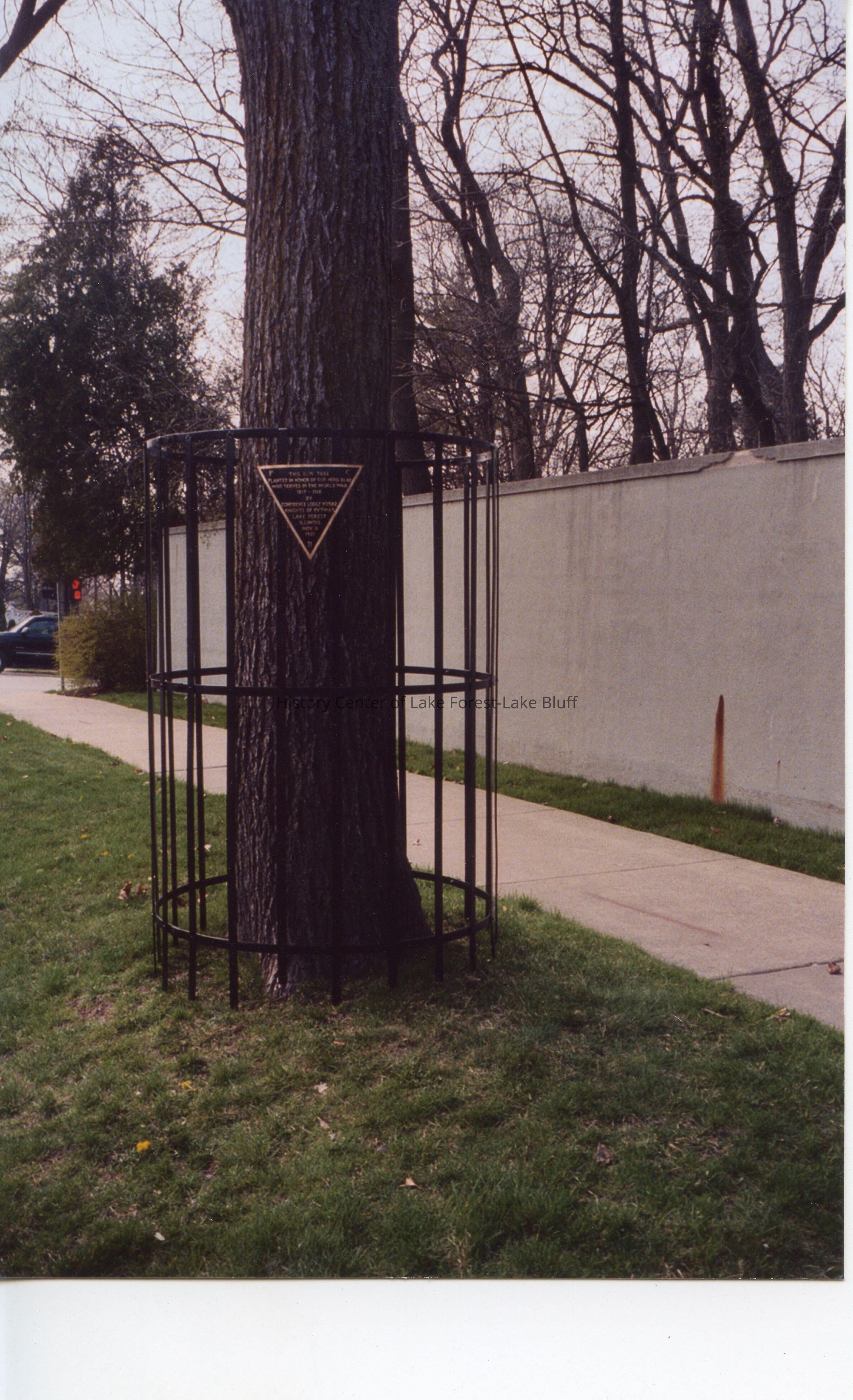 Photograph of plaque installed on fence surrounding elm tree at Green Bay Road and Deerpath Road. Planted by Confidence Lodge No. 582 of the Knights of Pythias in honor of soliders killed in World War I. Installed November 11, 1921. Photo taken when fence was reinstalled.