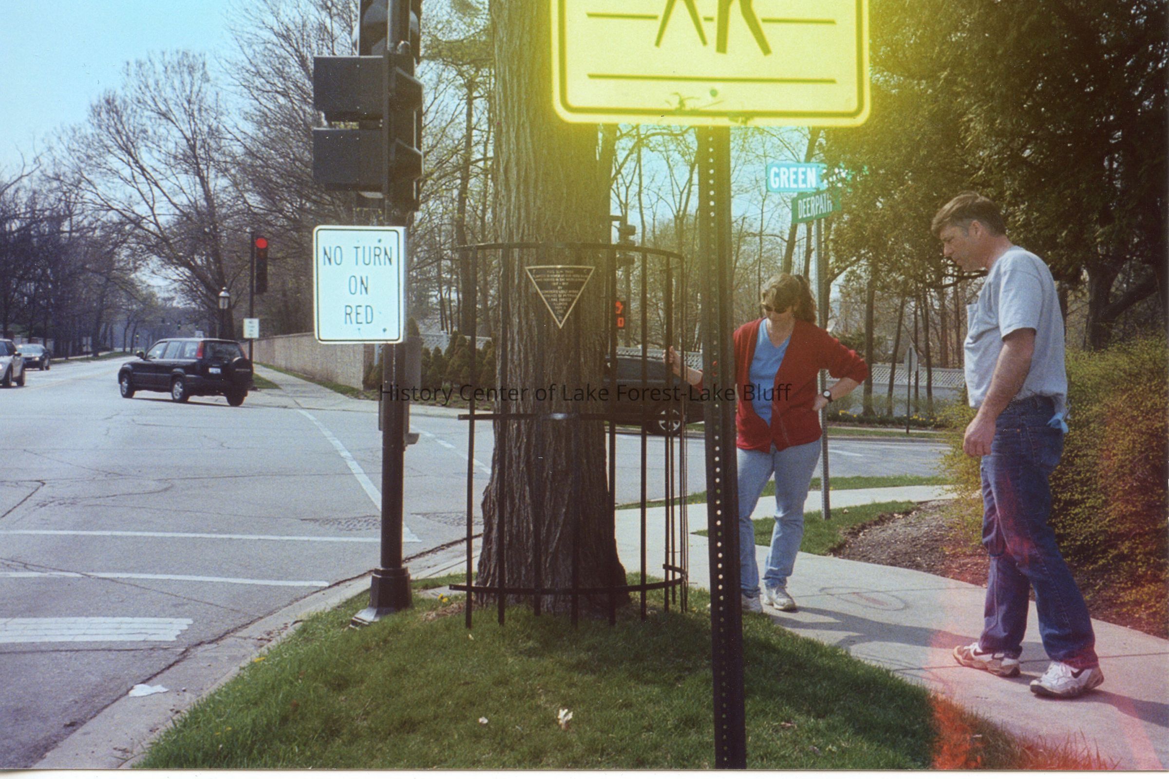 Photograph of plaque installed on fence surrounding elm tree at Green Bay Road and Deerpath Road. Planted by Confidence Lodge No. 582 of the Knights of Pythias in honor of soliders killed in World War I. Installed November 11, 1921. Photo taken when fence was reinstalled by Ken Paddock and Chandra Paddock Solberg.