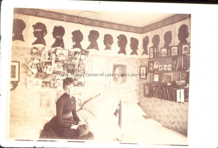 Unidentified interior, with lots of silhouettes on walls. Grace Farwell (?) seated on bed
