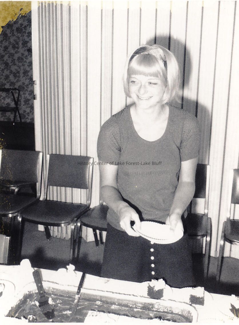 Young lady holiding a desert plate, standing in front of a pan of cake. Photographs relating to Lake Forest Hospital collected for the 100th Anniversary of the Hospital by the Development Department.