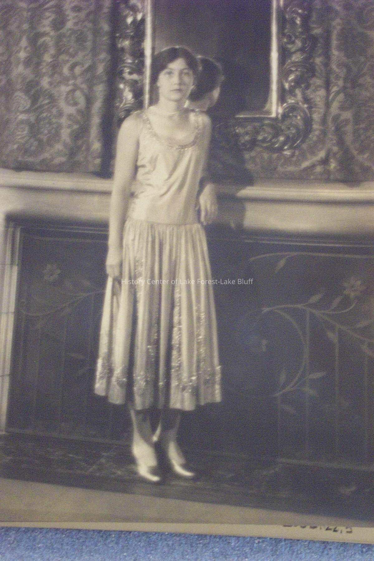 Young woman standing in front of fire place with ornate mirror and drapery in sleeveless dress with sparkles