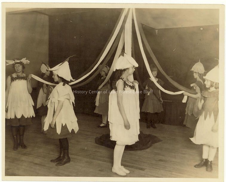 Lake Forest YWCA - Young Women's Christian Association Girls in costumes around a May pole, indoors.