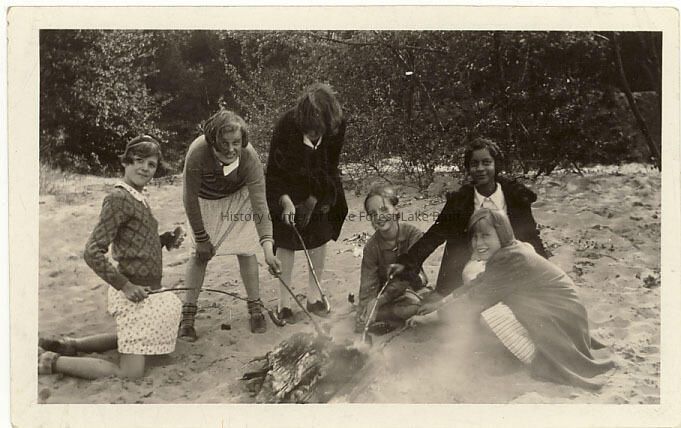 Lake Forest YWCA - Young Women's Christian Association Grade School Girl Reserves six girls on beach having a campfire