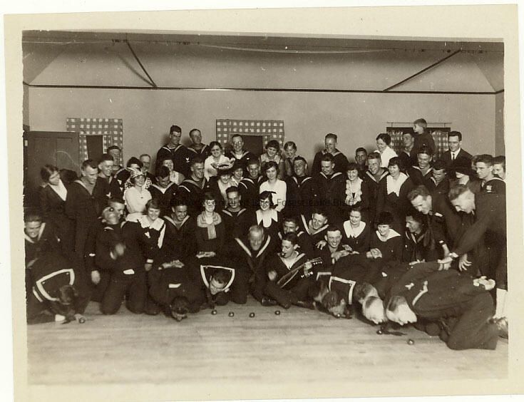 Lake Forest YWCA - Young Women's Christian Association Party for Navy servicemen from Great Lakes. Some sort of game where people are pushing something round on the floor with their faces.