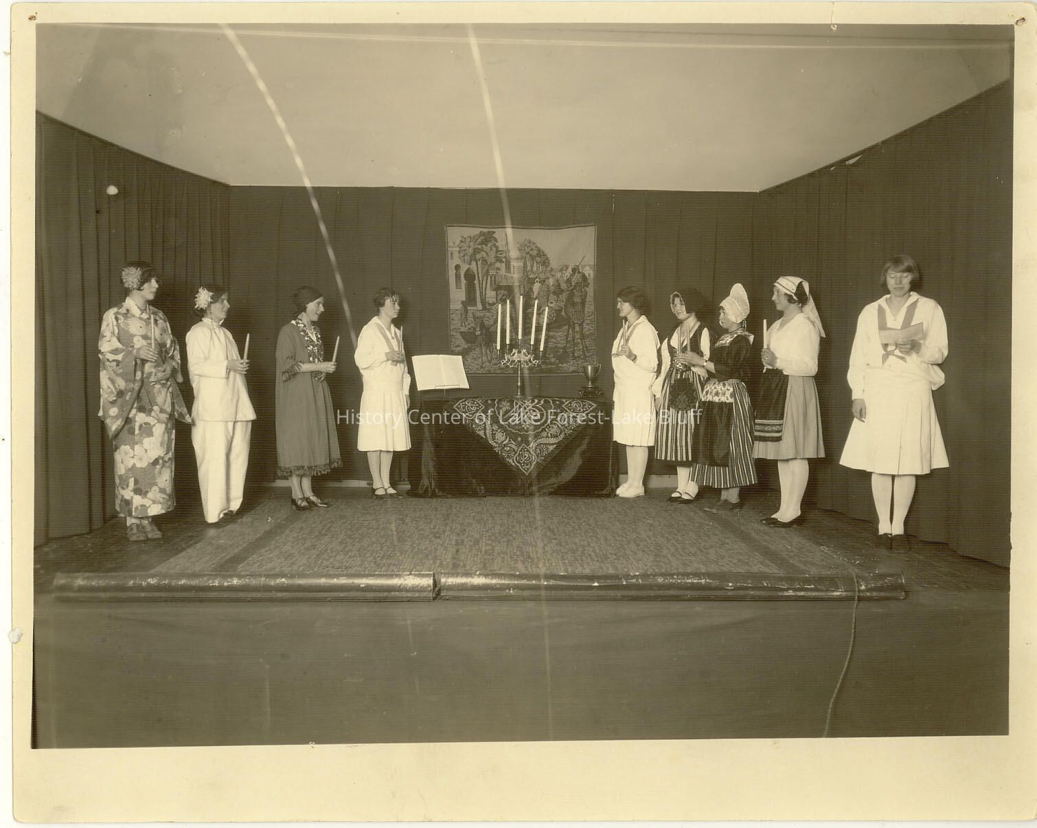 Lake Forest YWCA - Young Women's Christian Association J.R. Play, women in International costumes 1. Adelaide Baldwin; 2. Peggy Wilson; 3. Bernice McGovern; 4. Helen Fellows; 5. Jane Coulson; 6.?; 7.?; 8. Ida Quarta; 9. Mary Elizabeth Jackman