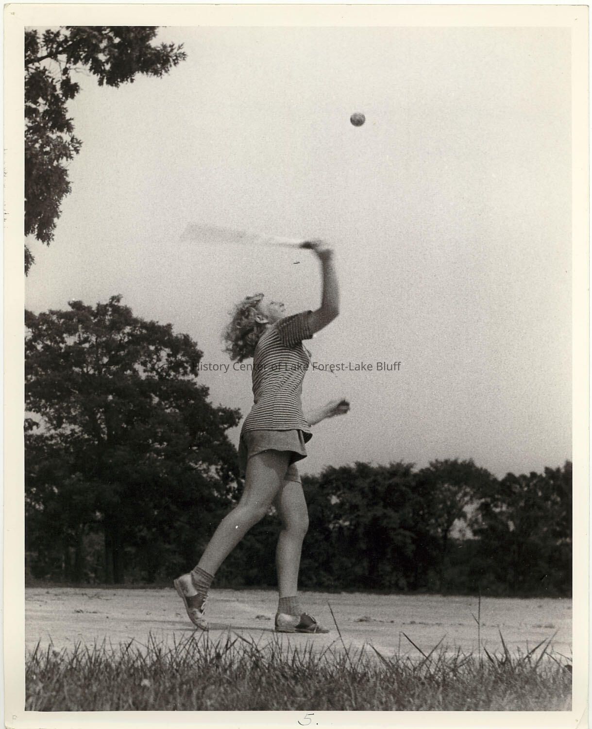 Lake Forest YWCA - Young Women's Christian Association Play-At-Home Camp Tennis Betty Jane Metzger serving.