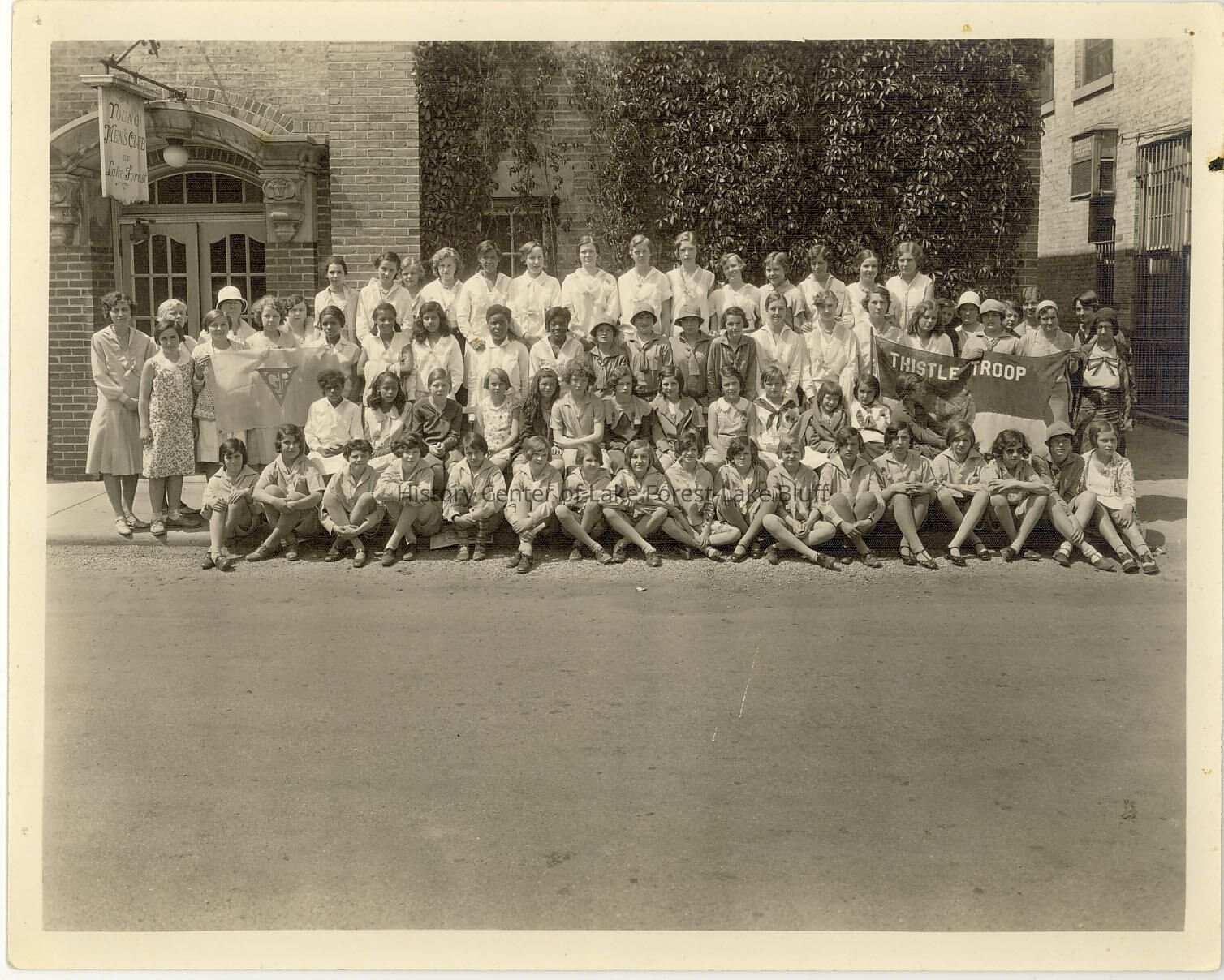 Lake Forest YWCA - Young Women's Christian Association YWCA and Girls Scouts Thistle troop group photo in front of the Young Men's Club building in Market Square