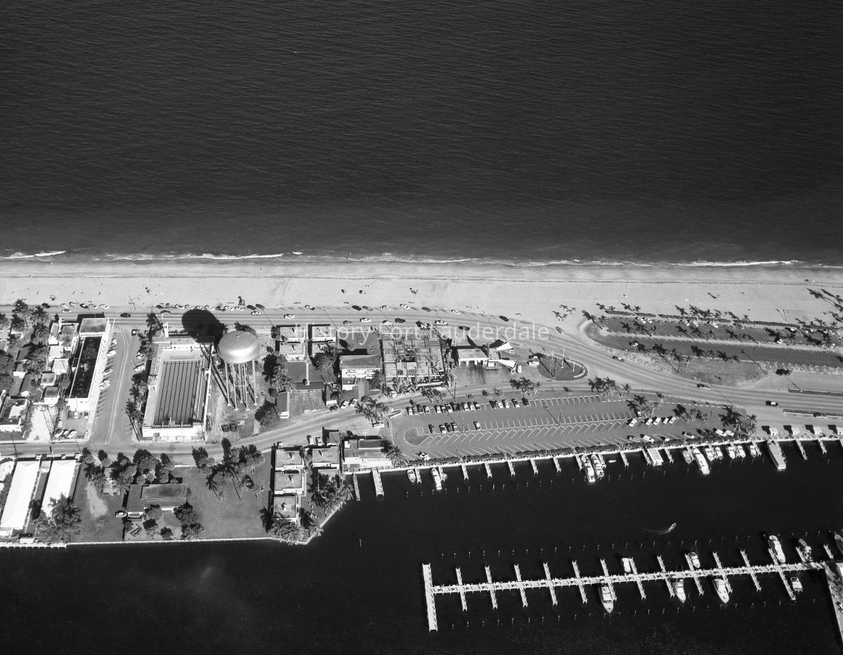 Aerial view of A1A, the beach, Intracoastal & SE 4 St (Illini). Casino Pool is pictured left of the water tower. Partial of Bahia Mar marina.