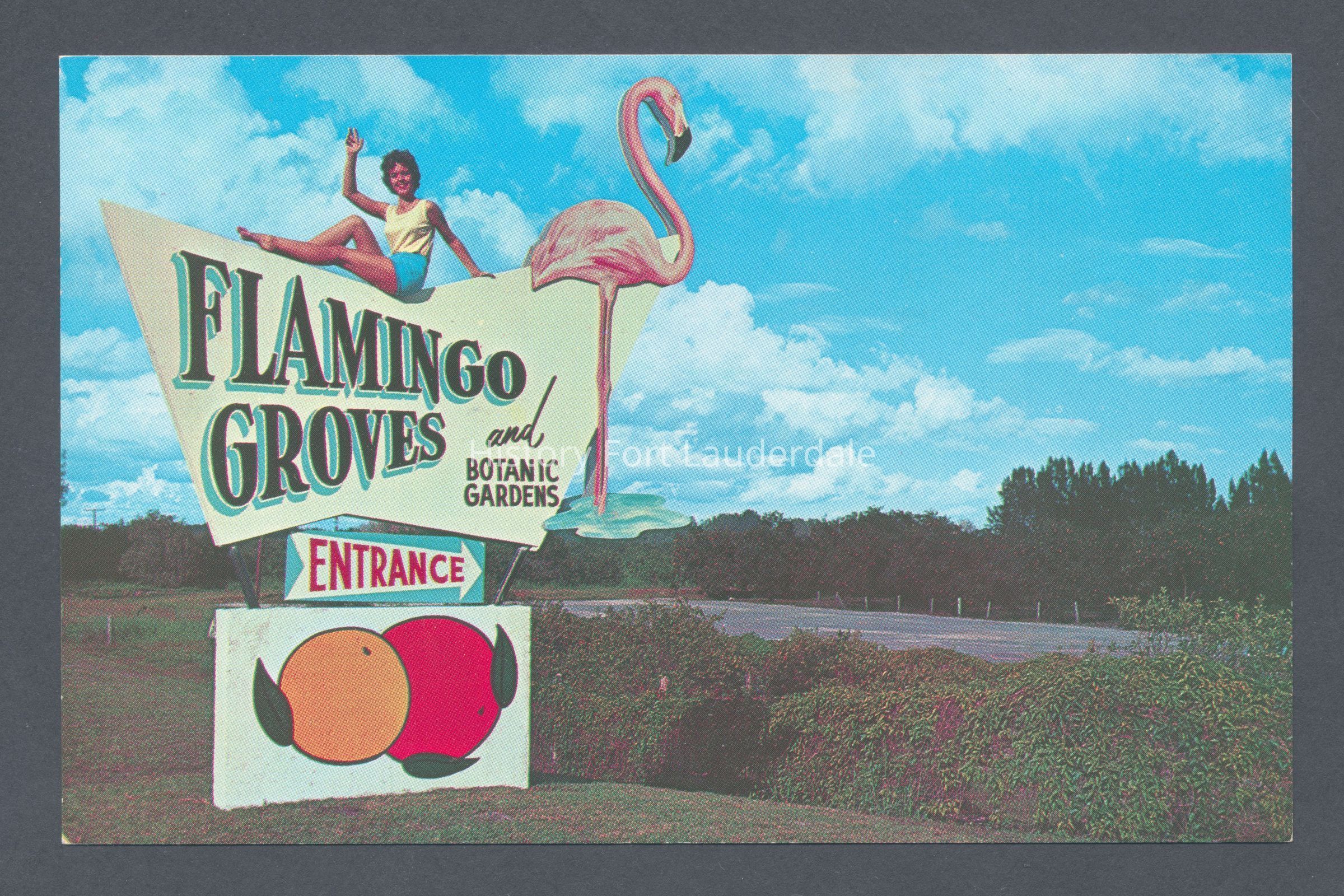 Text on reverse: "Floyd Wray's Flamingo Groves and Tropical Gardens, one of South Florida's oldest and finest tourist attractions. In the Groves there are 460 acres of citrus trees which include 76 varieties of fruit. In the Gardens there are 700 botanic trees from all over the world. Citrus gifts and Florida souveniers sold at the Grove Store, Ft. Lauderdale, Florida."