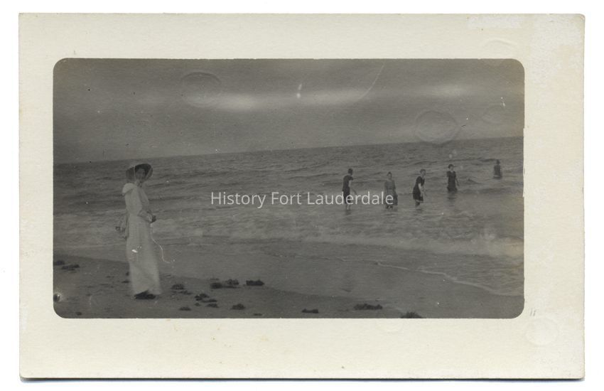 Five people (one man and four women) wading in the surf at the beach. Woman in white dress and bonnet standing on the shore.Collection
