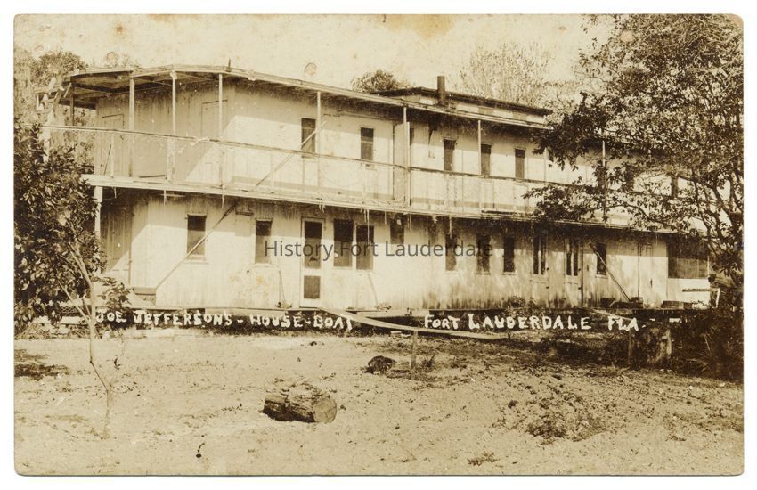 Ahows double deck houseboat, parked in New River W of Ft. Lauderdale, near New River grove, among some trees.Collection