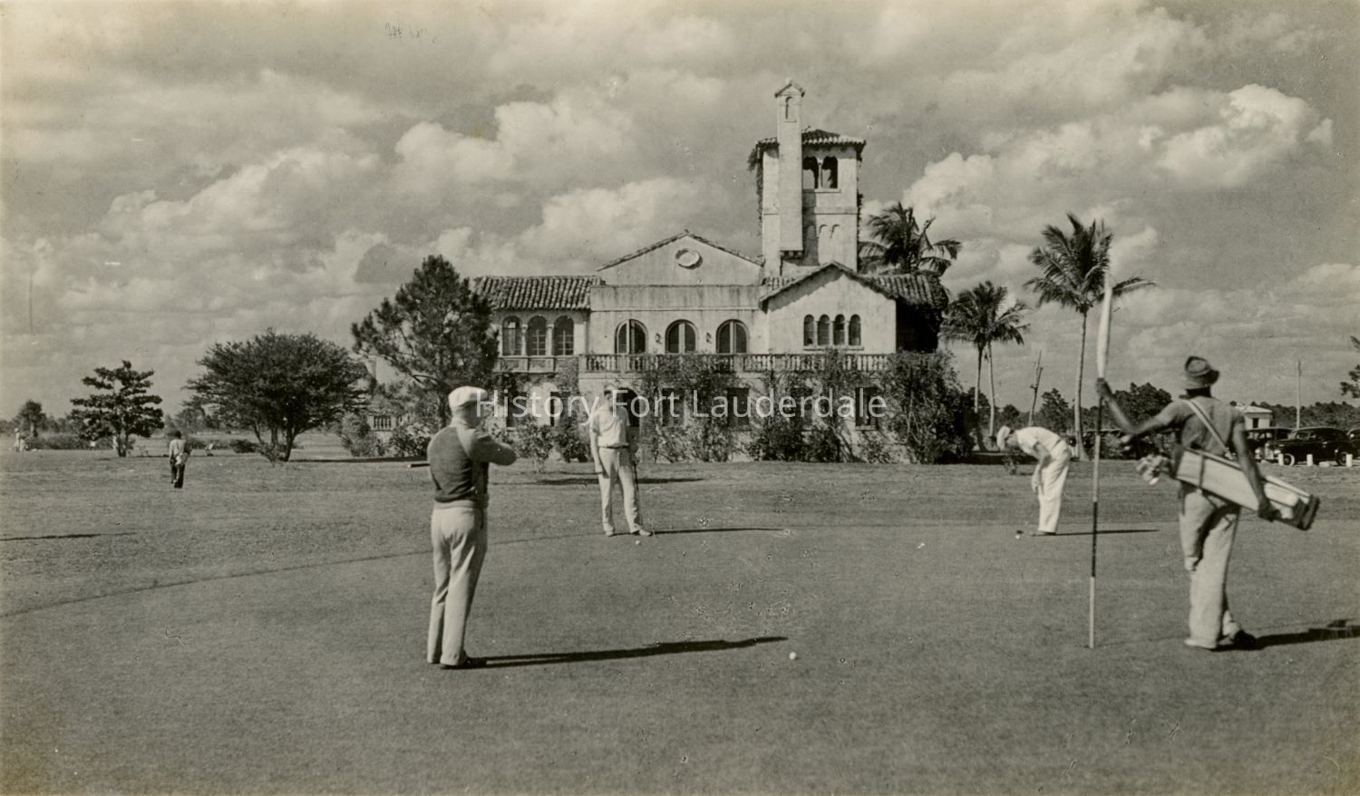 Exterior view of the Fort Lauderdale Golf and Country Club (Westside Golf Club) at 415 Country Club Circle. Three men and their African-American caddie playing golf.Collection