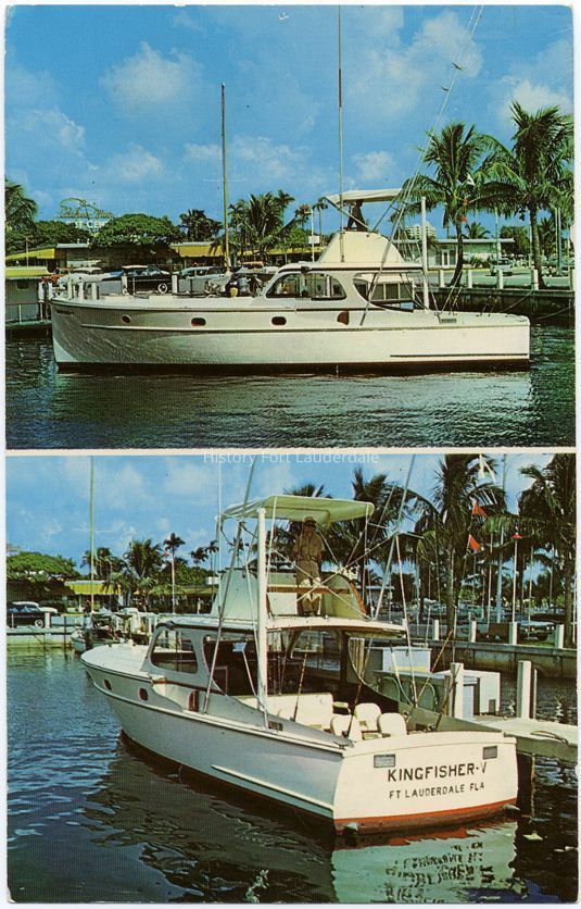 Two photographic images of King-fisher fishing boat docked at Bahia Mar Yacht Basin. Top image is a side view. Bottom image is view of the rear of the boat.
