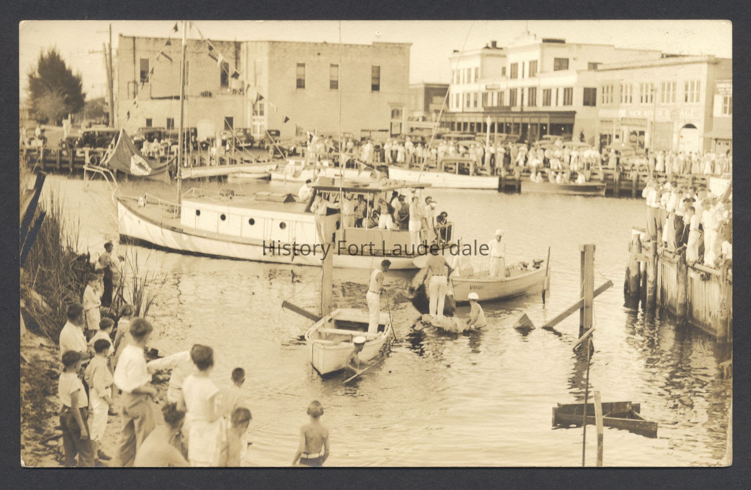 One boat and two small boats on New River. Many spectators watching from land. People watching the boats coming in to dock at the Andrews Avenue bridge; good view of part of downtown Fort Lauderdale.