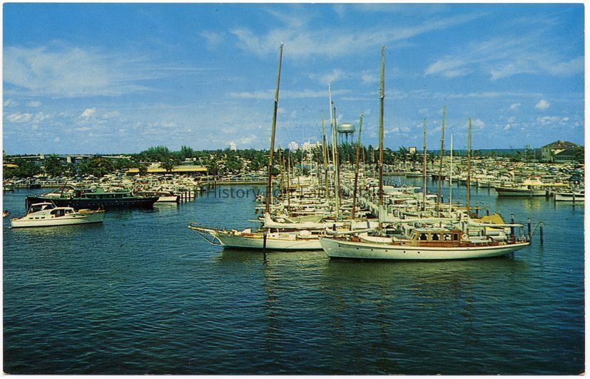 Many boats at dock at Bahia Mar Yacht Basin. Water tower in distance.