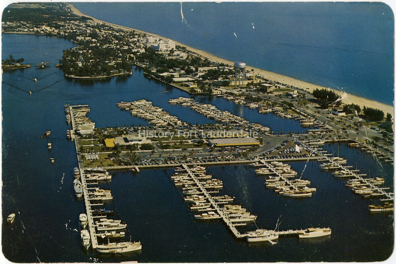 Aerial view of Bahia Mar looking northeast. Water tower and Las Olas Casino Pool in upper center.