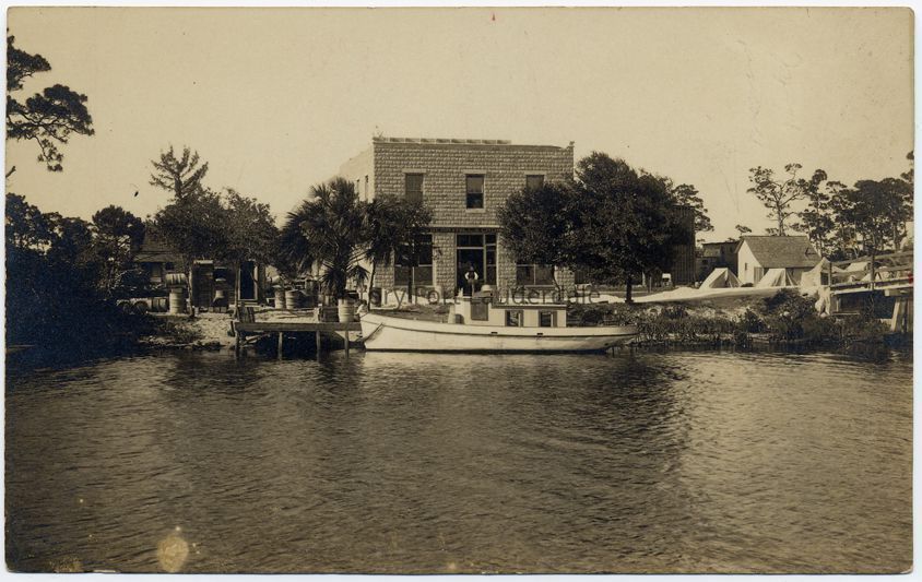Two-story masonry building on the north bank of the New River, just west of the Andrews Avenue bridge. Boat docked in front. Tent city to the right.