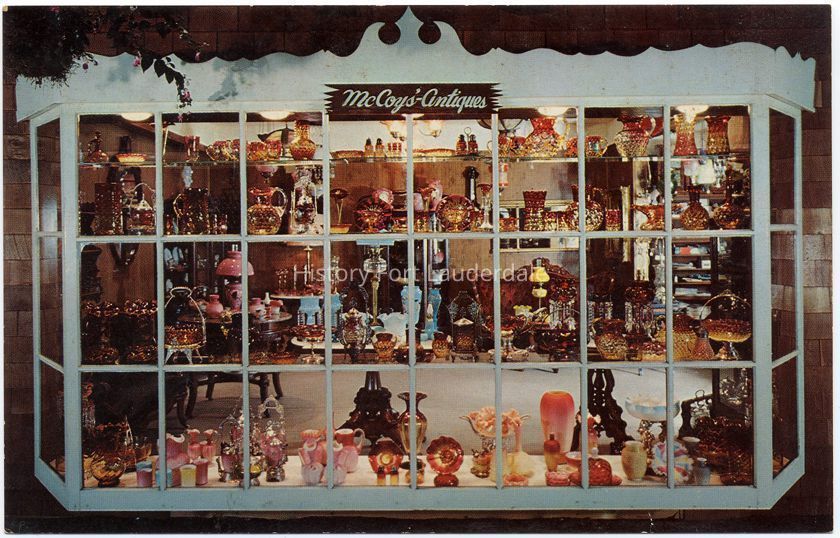 Display window of McCoy Antiques, 428 NE 3rd Avenue. Sign over window says McCoys'-Antiques.