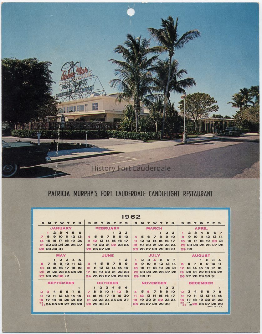 Exterior view of Patricia Murphy's Candlelight Restaurant. Street, parked car and palm trees in foreground. Bottom half of postcard is 1962 calendar.