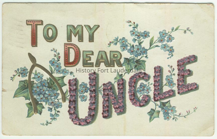 "To My Dear Uncle" in large text. "Uncle" made out of purple flowers. In background, light blue flowers and ivy, and gold wishbone.