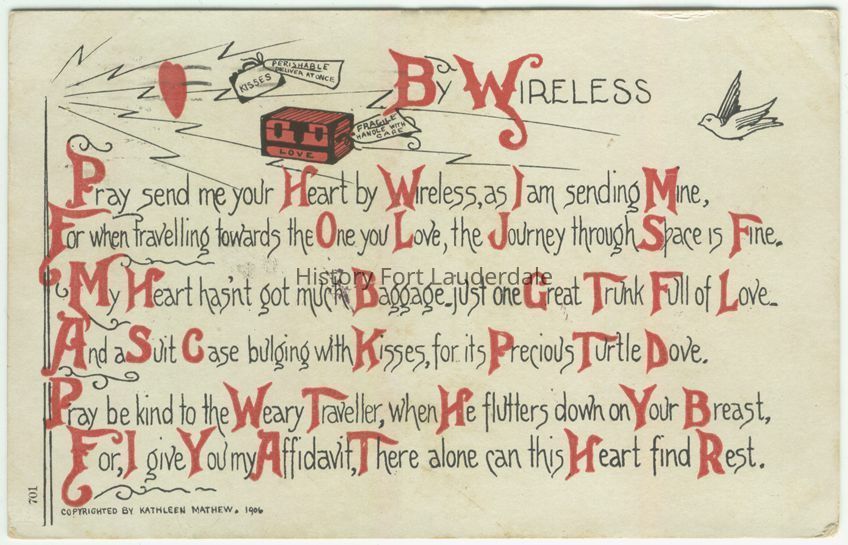 Poem titled "By Wireless." Capital letters in red. Illustrated with heart, bird, package.