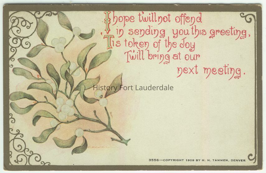 Mistletoe branch on left side. Poem on right side of postcard. Gold border.